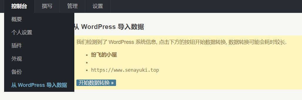 此时控制台里会多出一个从WordPress导入数据,开始转换,静候提示转换完成